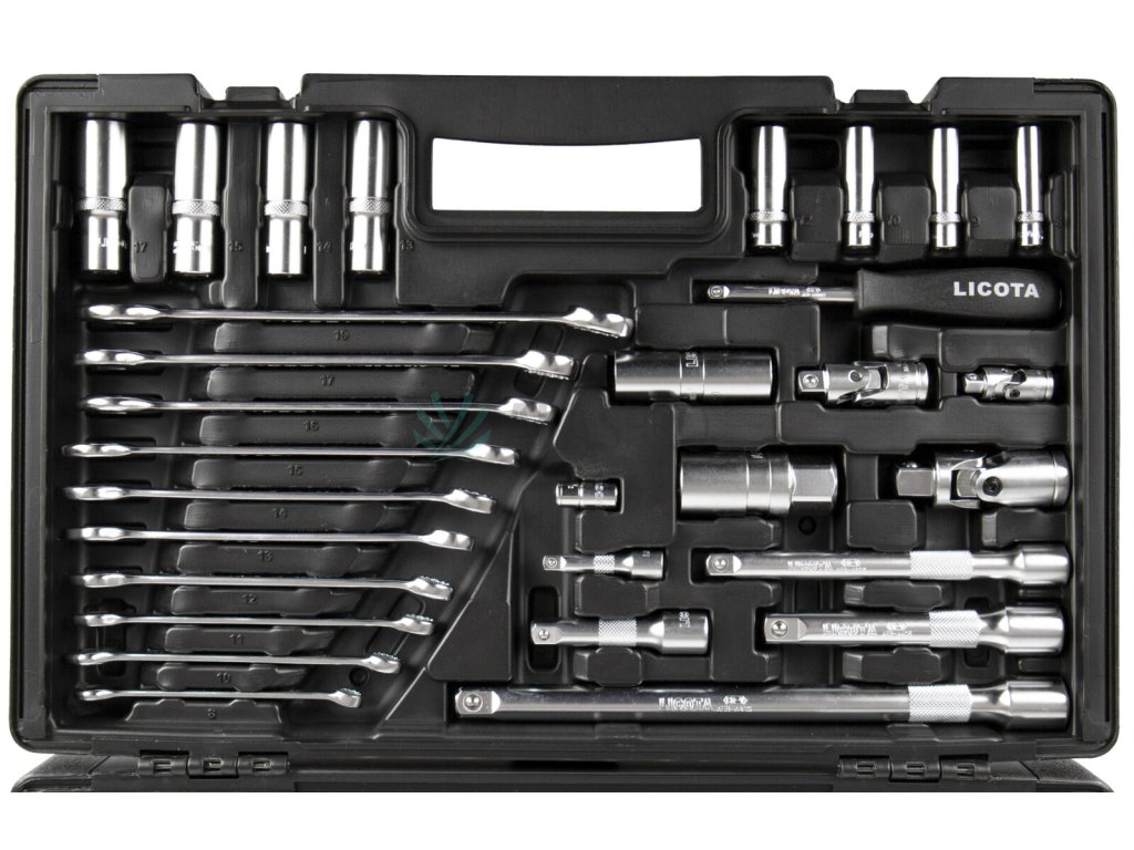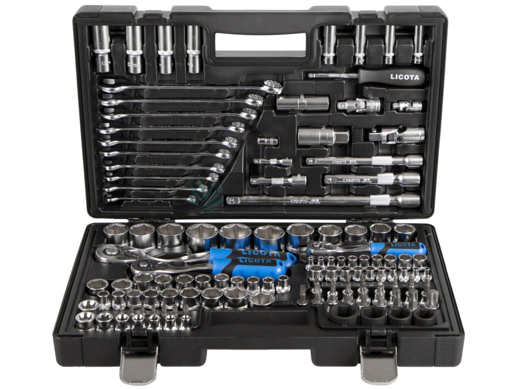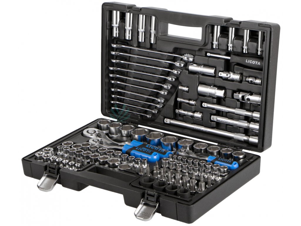 Profesionální gola sada LICOTA, 120 kusů v plastovém kufru, obsahuje nástrčné klíče 1/4", 3/8" a 1/2", ráčny, kloubové a prodlužovací adaptéry, nástavce na žhavící svíčky, bity,..