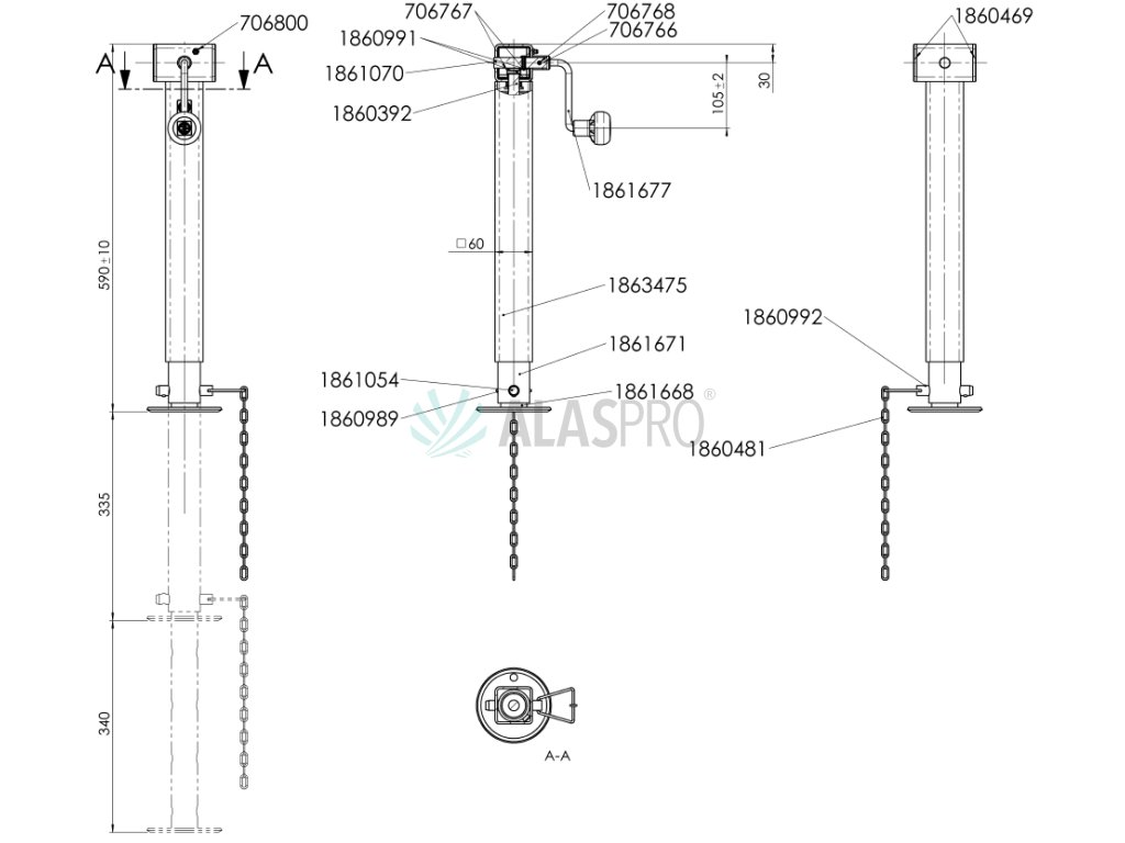Opěrná noha s klikou a zajišťovacím kolíkem. Otáčením klikou lze nohu vysunout až o 335 mm. Pomocí zajišťovacího kolíku je možné zajistit výsuv o dalších 340 mm. Nohu lze navařit na rám přímo ve svislé pracovní poloze, anebo je možné navařit na nohu přírubu s aretačním kolíkem. V takovém případě je možné určit bod otáčení nohy a volit mezi svislou pracovní polohou a horizontální transportní polohou.