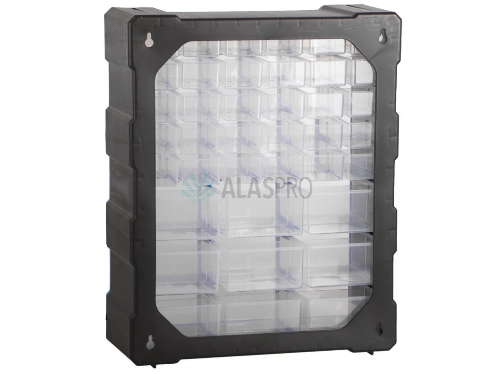 Plastový organizér s 39 zásuvkami lze jednoduše zavěsit na zeď, nebo např. z boku skříně, dílenského vozíku apod. Je možné ho postavit na ponk, nebo pracovní stůl a slouží pro uložení montážního materiálu a drobného dílenského vybavení.