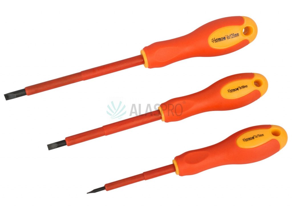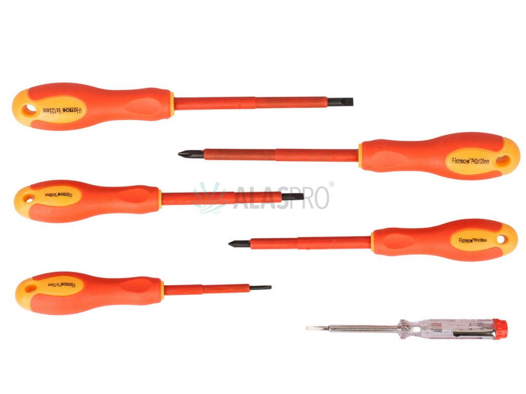 Elektrikářské šroubováky VDE v sadě 6 kusů se zkoušečkou napětí značky Hoteche umožňují bezpečnou práci se zařízeními pod napětím do 1000 V.