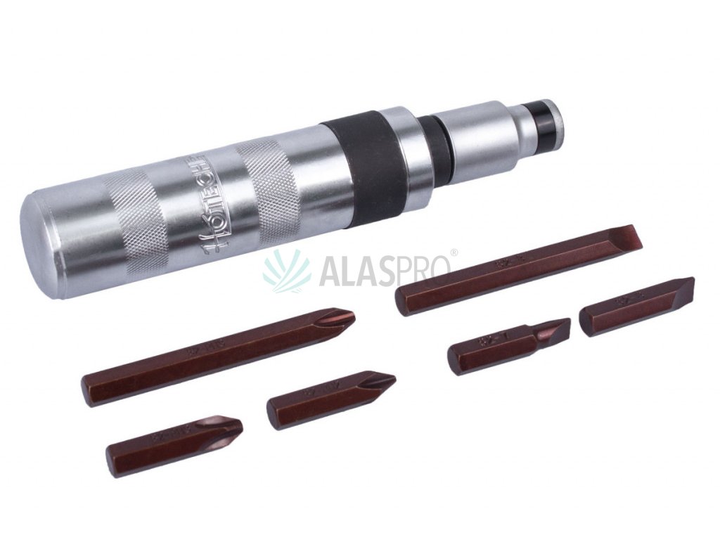 Sada od značky Hoteche, která obsahuje úderový šroubovák s plochými (3 ks) a křížovými (3 ks) bity v boxu.